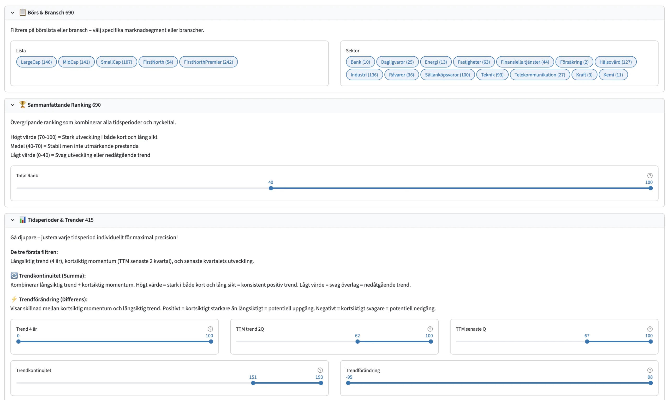 Se omedelbart vilka aktier som matchar dina filter, rankade efter totalrank.