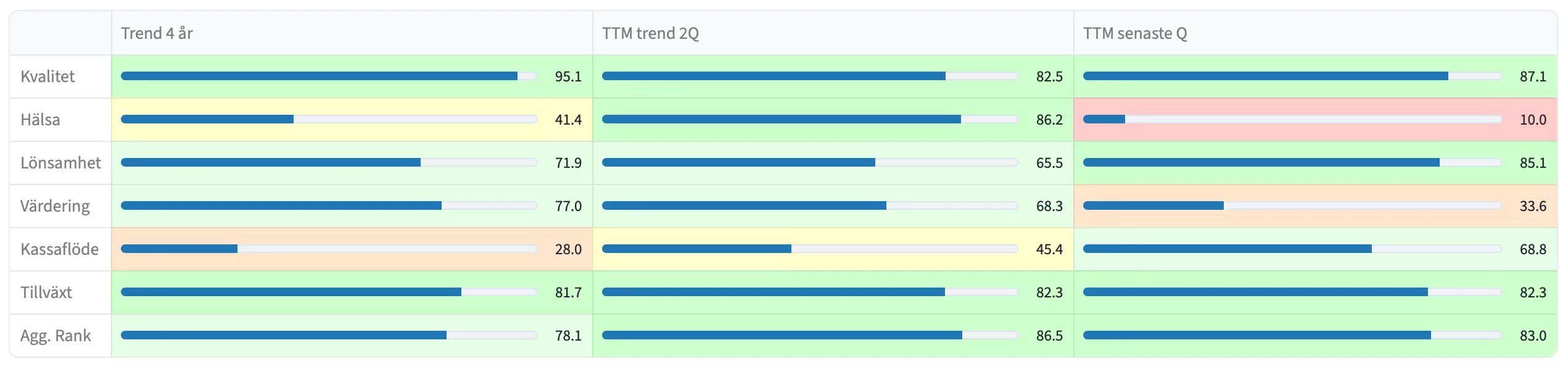 Välj bland 6 rankingkategorier; Kvalitet, Hälsa, Lönsamhet, Värdering, Kassaflöde, Tillväxt (och dess underliggande nyckeltal).