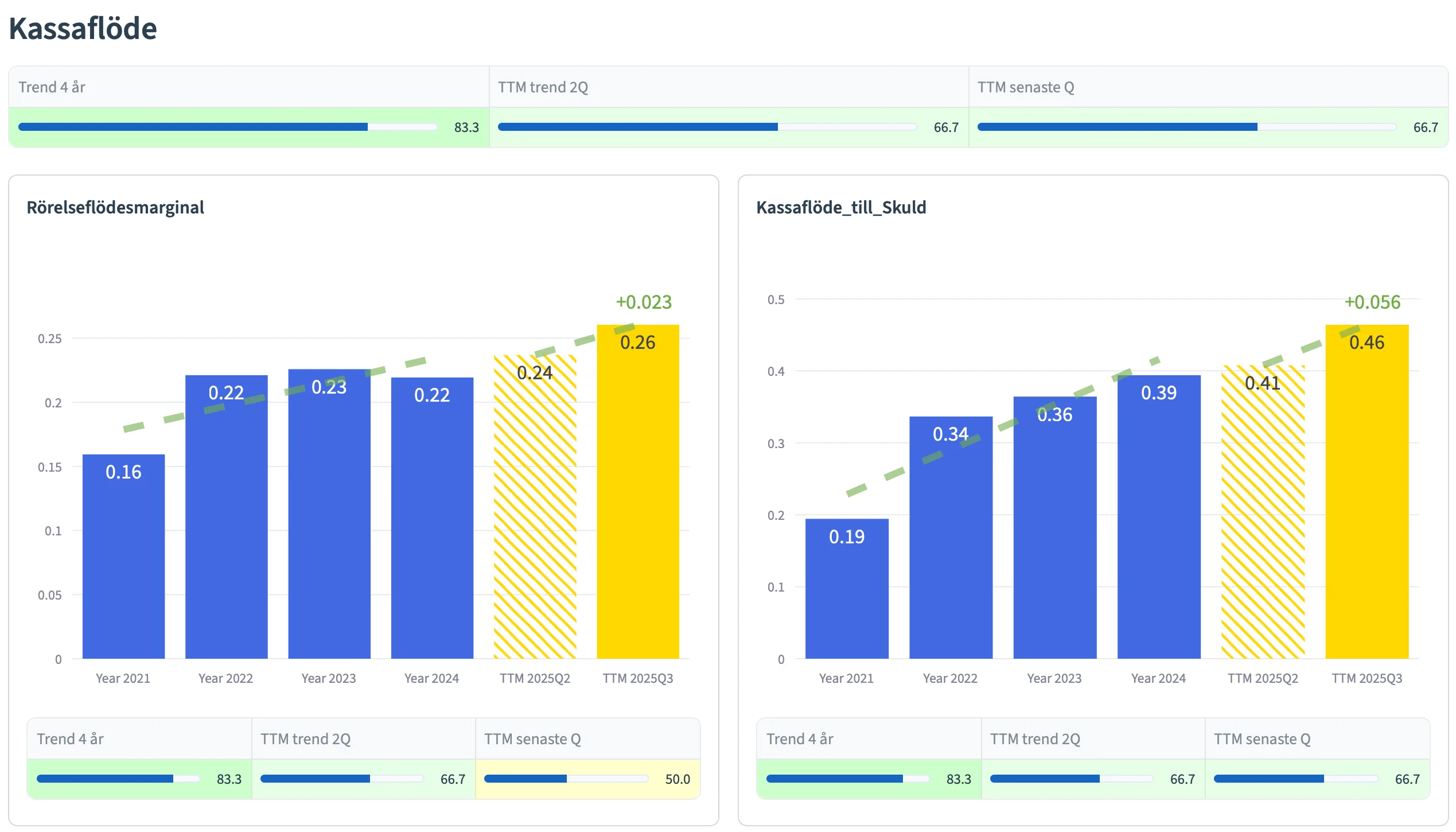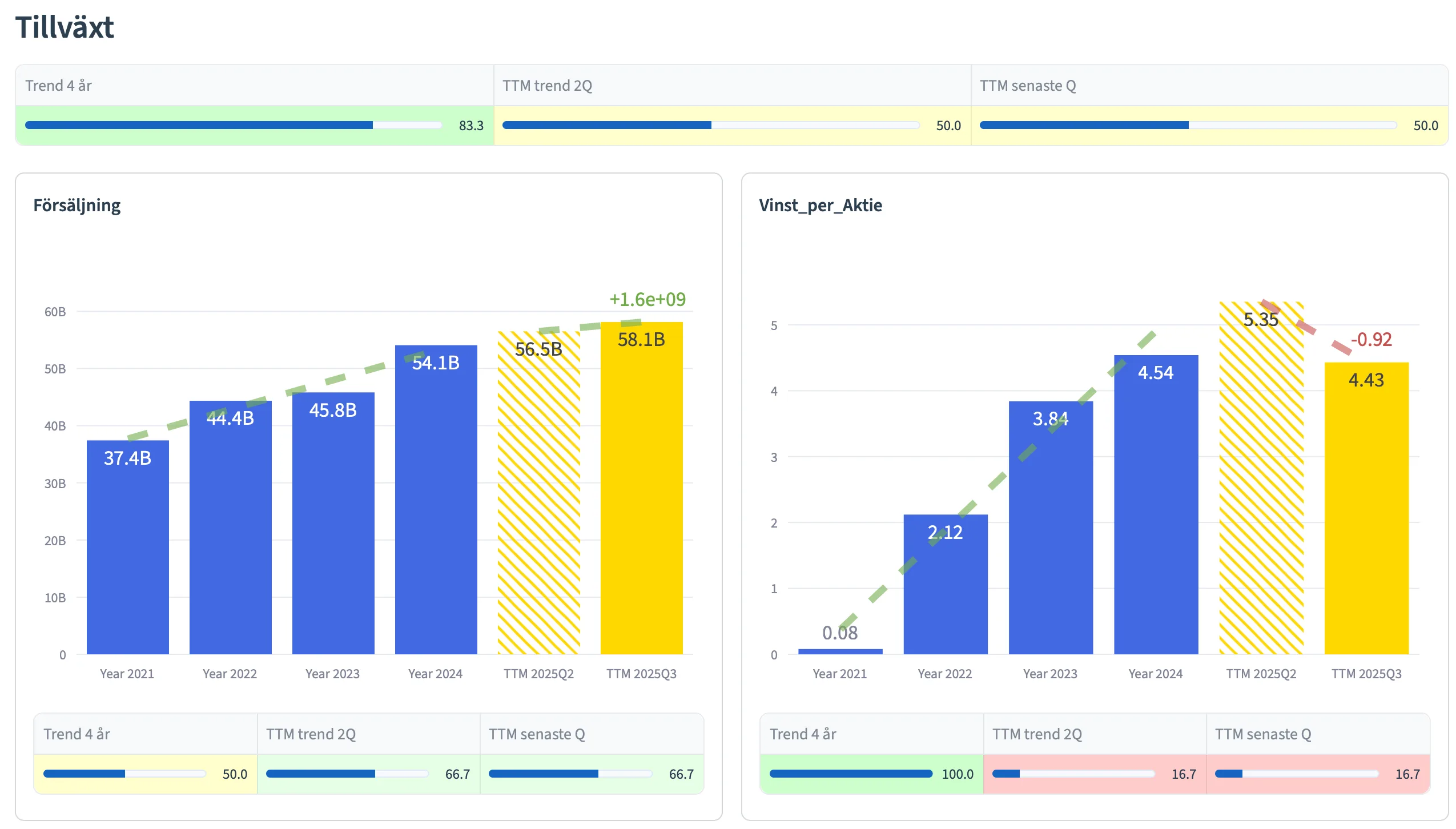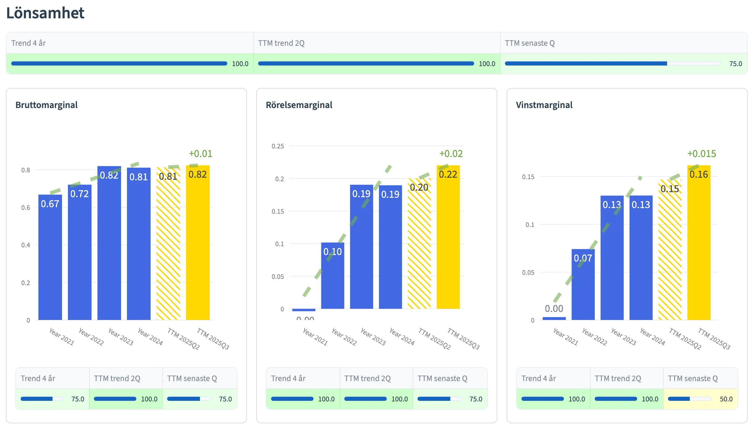 Graferna ger dig en överblick från olika tidsperioder; de senaste 4 åren (blå staplar), de senaste 2 TTM kvartalen (gula staplar), samt senaste TTM kvartalet (högra gula stapeln).