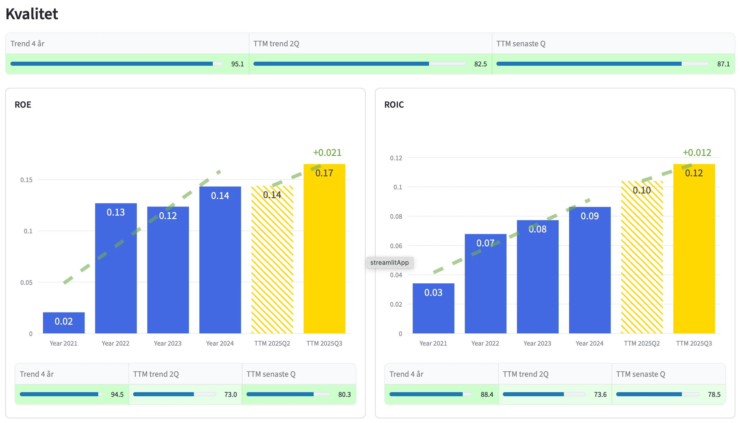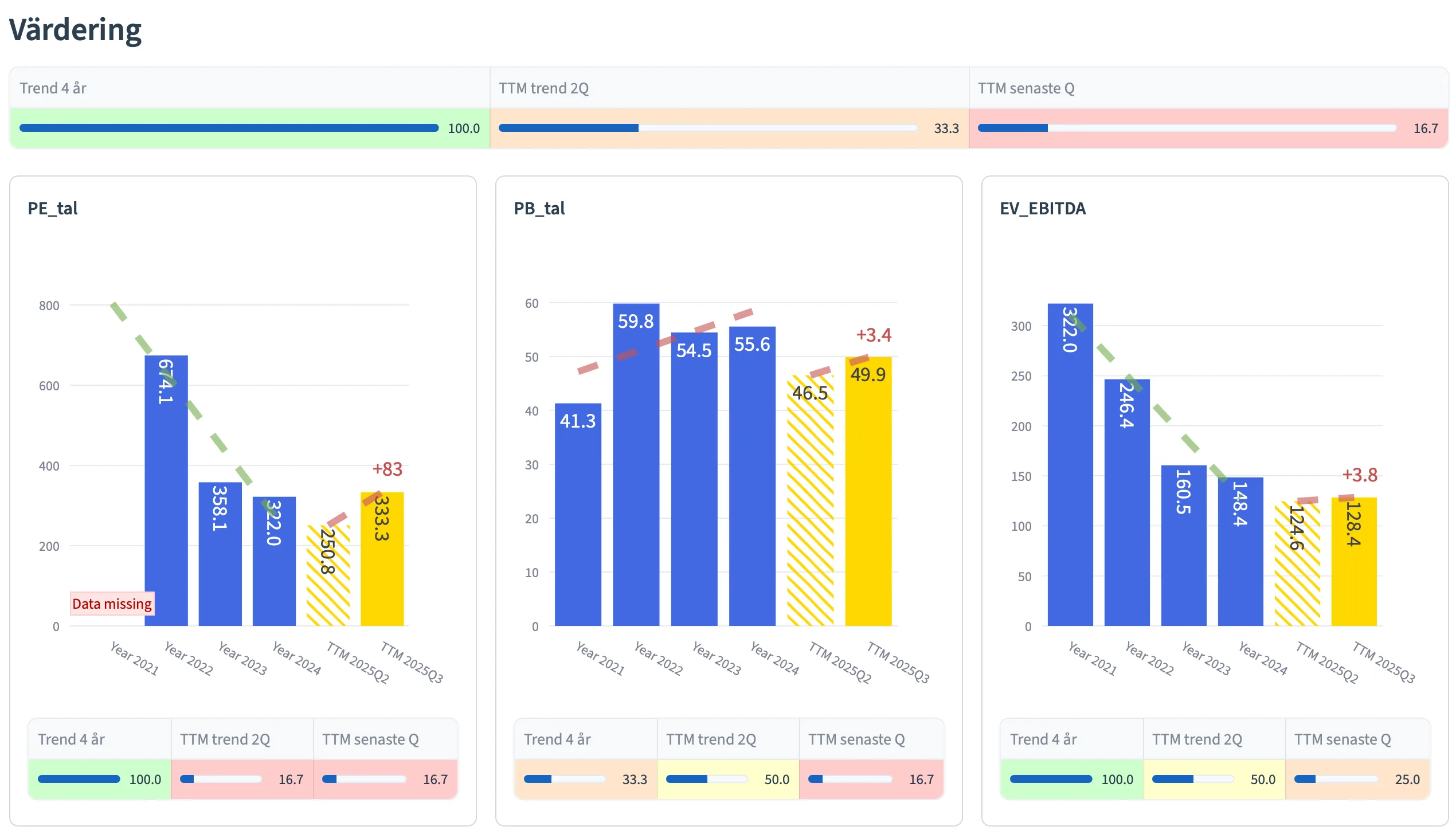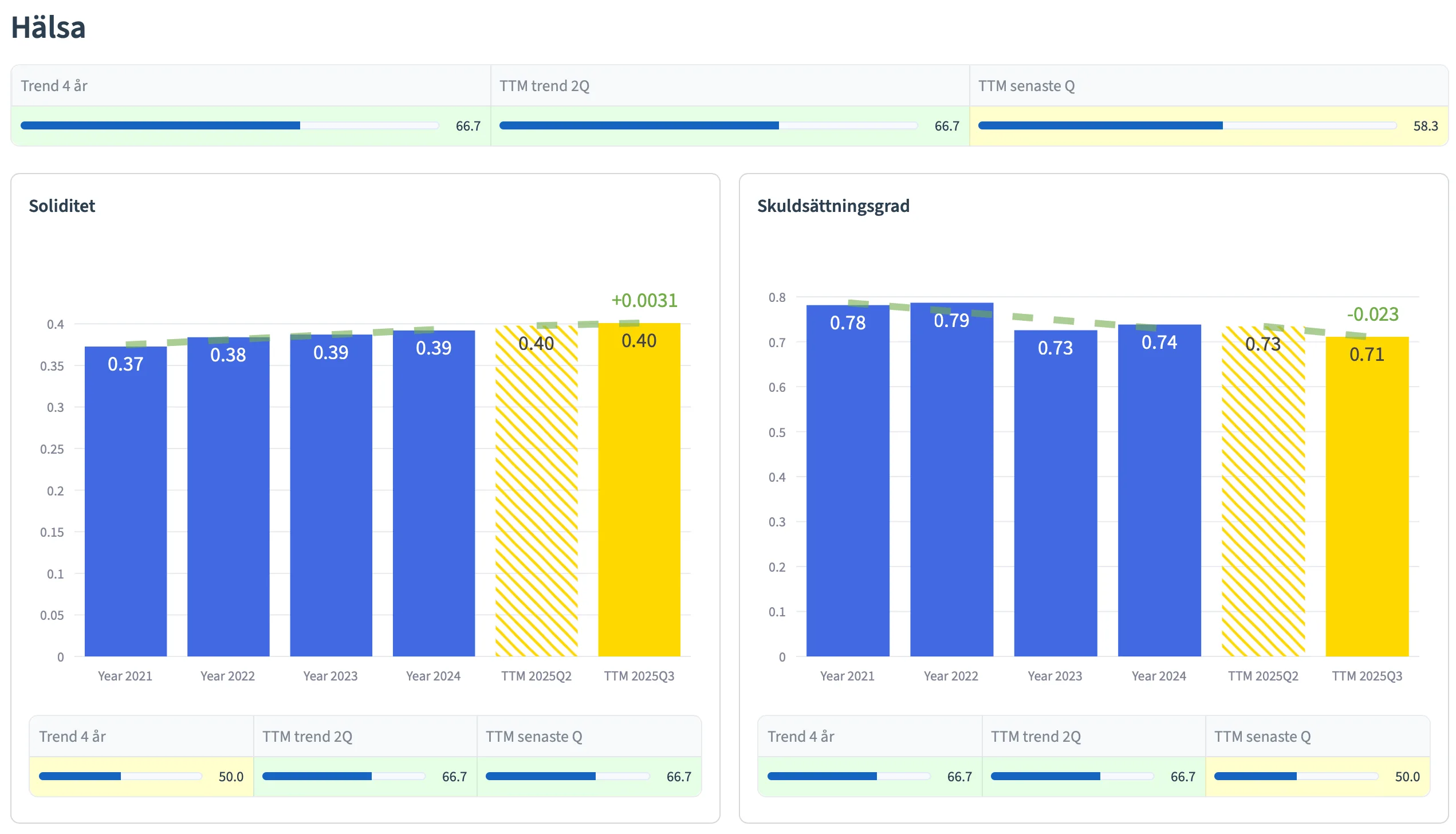 Graferna ger dig en överblick från olika tidsperioder; de senaste 4 åren (blå staplar), de senaste 2 TTM kvartalen (gula staplar), samt senaste TTM kvartalet (högra gula stapeln).