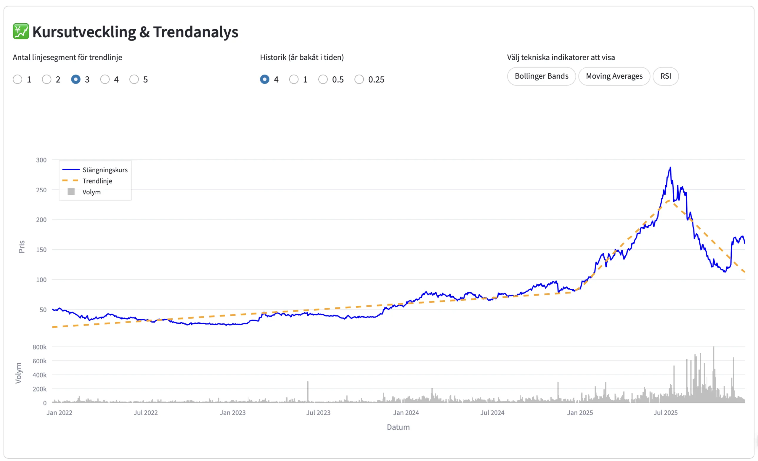 Välj hur många segment du vill ha på din trendlinje och vilka tekniska indikatorer du vill se i grafen.