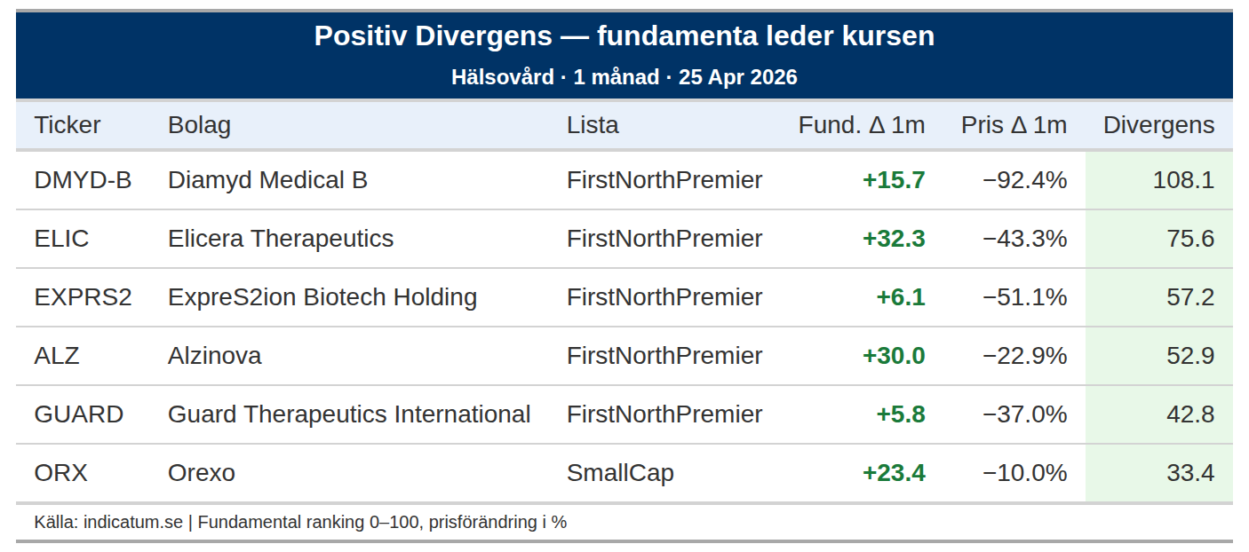 De starkaste positiva divergenserna återfinns i bolag som DMYD-B och ELIC, där fundamenta har förbättrats med 15,7 respektive 32,3 rankingpoäng, men priset har sjunkit med -92,4% respektive -43,3%. Detta kan tyda på att det finns nyheter eller händelser utanför fundamenta som driver kursen, snarare än en renodlad fundamental divergens, särskilt i fallet med DMYD-B där kursfallet är mycket kraftigt och kan bero på andra faktorer som kliniska studieresultat eller emission.