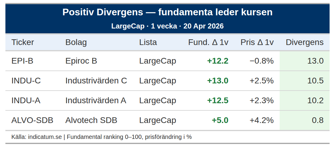 De starkaste positiva divergenserna återfinns bland annat inom finanssektorn, där Industrivärden C och Industrivärden A båda visar en förbättring av fundamenta med +13,0 respektive +12,5 rankingpoäng, samtidigt som prisutvecklingen varit mer modest. Inom hälsovårdssektorn ses en positiv divergens för Alvotech SDB, med en förbättring av fundamenta på +5,0 rankingpoäng och en prisutveckling på +4,2%. Dessa mönster tyder på att marknaden möjligen underskattar dessa bolags fundamentala styrka, vilket kan skapa intressanta investeringsmöjligheter.