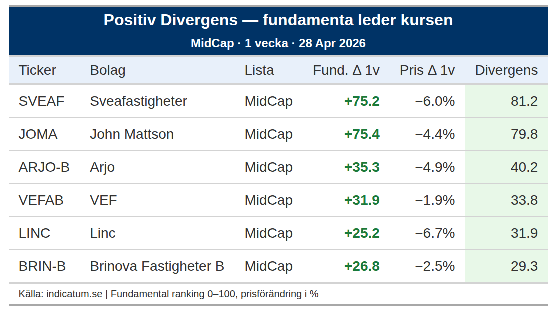 - Positiv divergens: Fundamenta förbättras men kursen släpar efter → Potentiell undervärderad möjlighet