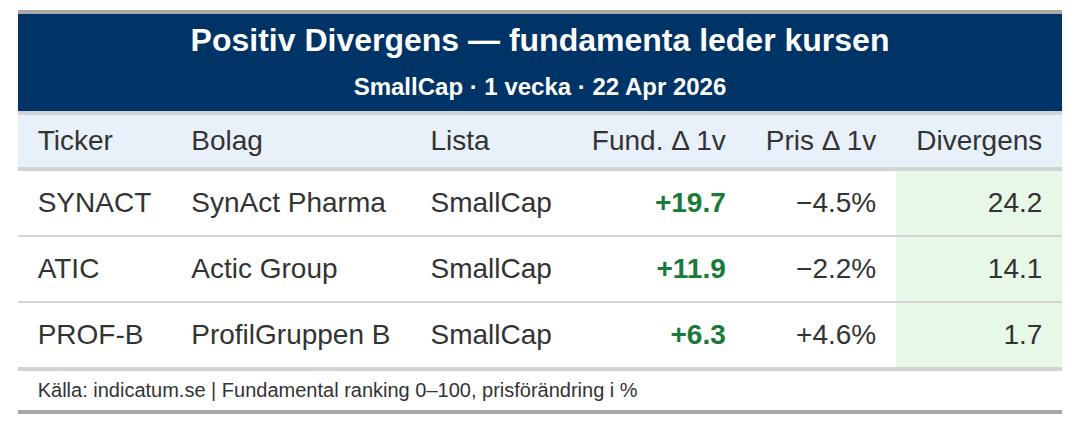 De starkaste divergenserna finns bland annat i bolag som SynAct Pharma, som visar en positiv divergens med en förbättring av fundamenta med 19.7 rankingpoäng, men en prisnedgång på 4.5%. Å andra sidan finns negativa divergenser i bolag som Boule Diagnostics, som har en försämring av fundamenta med 41.8 rankingpoäng, men en relativt stabil prisutveckling. Det kan vara värt att undersöka om det finns nyheter eller händelser utanför fundamenta som driver prisutvecklingen i dessa bolag, snarare än en renodlad fundamental divergens.